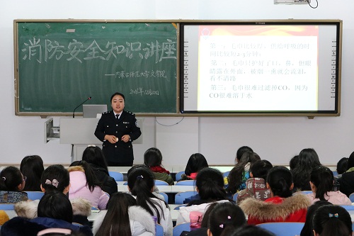12月20日下午,pg娱乐官网特邀内蒙古自治区消防法治研究会一级教官贺文婧作消防安全知识专题讲座,pg娱乐官网团总支书记牛海龙和200多名学生聆听了讲座。贺教官重点介绍了近年来一些典型的火灾及其造成的严重后果,并讲解了火场逃生的方向、手段及如何使用灭火器材,同时纠正了学生生活中的一些错误习惯。讲座结束后,学生们还进行了火灾逃生演练,并于户外空地模拟现场灭火。