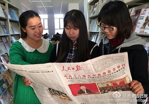 112日上午,pg娱乐电子游戏官网入口团总支组织该院学生深入学习十八届五中全会精神,切实领悟两个一百年奋斗目标的深刻内涵。图为学生正在学习十八届五中全会公报。袁耀先  摄