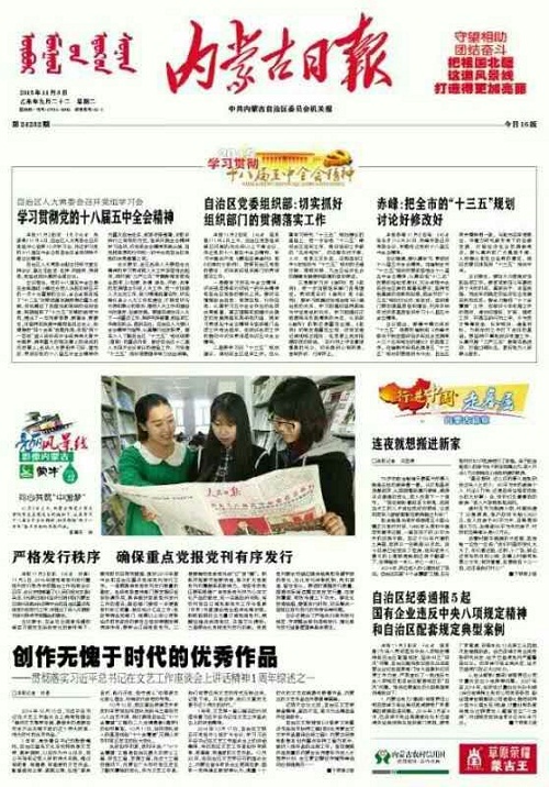 《内蒙古日报》2015年11月3日第一版报道了该项活动,以下为内蒙古日报截图。