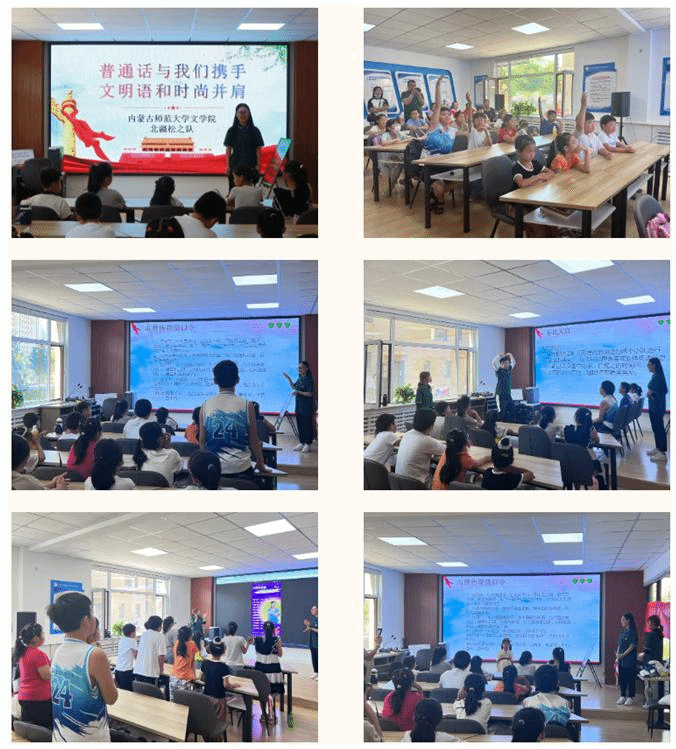 在本次推普活动过程中,实践队发挥专业所长,以“普通话与我们携手,文明语和时尚并肩”为主题,通过推普课堂深入走进敖汉旗秀水社区新时代文明实践站开展推普活动。实践队队员采取普通话概述,游戏环节,传唱《推普五字歌》等活动向小学学生介绍普通话,讲诉同说普通话的重要性并协助小学学生填写“推普助力乡村振兴”调查问卷,帮助小学学生排除错误发音,掌握并巩固常用字词的标准发音,倡导小学学生规范使用通用语言文字,说好普通话,为建设家乡贡献力量。