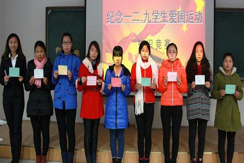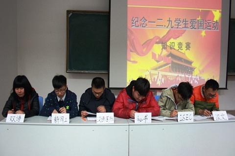为迎接“一二·九”运动80周年纪念日,12月6日晚七时,pg娱乐官网在盛乐校区行知楼举办了“纪念一二·九学生爱国运动”主题知识竞赛。 本次知识竞赛采用了知识竞答类节目《一站到底》的比赛形式,场上参赛选手全身心投入比赛,场下观众也积极参与到比赛当中。经过两轮激烈的角逐,汉语言文学系最终夺冠。