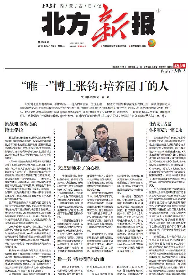 80后博士张钧有着与众不同的标签——他是内蒙古第一位也是唯一一位语文课程与教学论专业的博士生,师从北京师范大学刘淼教授。语文课程与教学论这个专业的博士点,目前全国仅有6个,每年培养的博士生不足10人,可谓绝对的稀缺。然而,师出名门的张钧却选择回到母校,回到他热爱的教师岗位,带着对教师这个行业的热爱,张钧培养出一批优秀的师范毕业生,也指导过许多一线教学的中小学语文教师。他梦想和为之奋斗的更高的目标是,让内蒙古的语文教学研究在全国学术界占据一席之地。