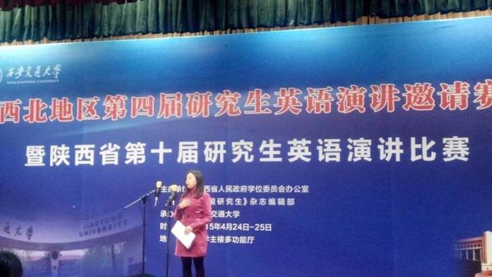 2015年4月24日至25日,西北地区第四届研究生英语演讲邀请赛暨陕西省第十届研究生英语演讲比赛在西安交通大学举行,本届大赛由陕西省人民政府学位办公室和 《中国研究生》杂志社联合主办,西安交通大学承办。pg娱乐官网2014级汉语国际教育硕士阿润作为我校第七届研究生英语演讲第一名获得者,代表我校参加了西北地区比赛,最终获优秀奖。我校公共外语教育学院老师郭玺平作为指导教师一同前往,并给阿润提供了详尽的指导。
