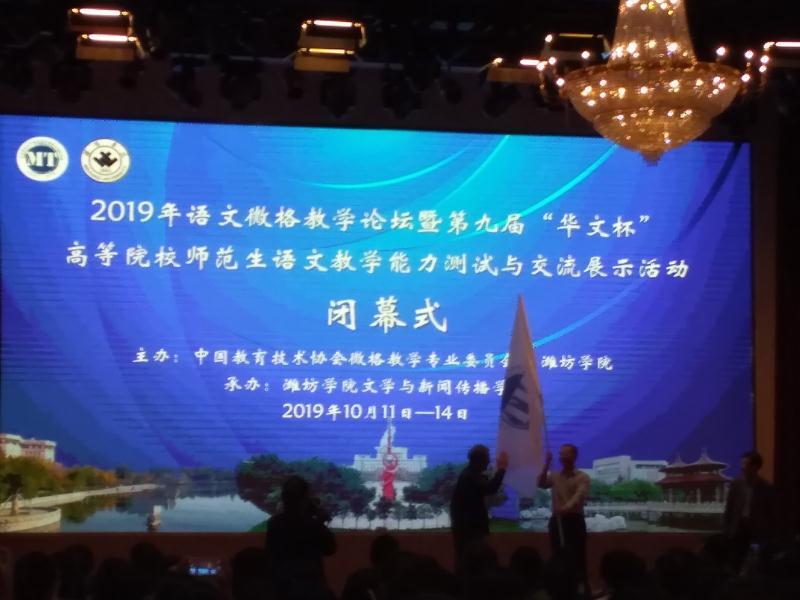 10月11日至14日,2019年语文微格教学论坛暨第九届“华文杯”高等院校师范生语文教学能力测试与展示活动在潍坊学院举行。pg娱乐官网本次选派两名全日制语文教育硕士和三名汉语言文学专业本科生参加比赛,经过与来自全国各地八十多所师范院校的495名师范生的激烈角逐,pg娱乐官网派出的选手吴彤获得教学技能一等奖,李轲跃和王一帆获得教学技能三等奖,蔡若梅和董晓丽获得教学技能优秀奖;吴彤获得教学设计二等奖,李轲跃获得教学设计三等奖,蔡若梅、王一帆和董晓丽获得教学设计优秀奖。其中,王一帆和董晓丽为全日制语文教育硕士,吴彤、李轲跃和蔡若梅为汉语言文学专业本科生。
