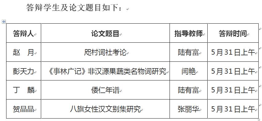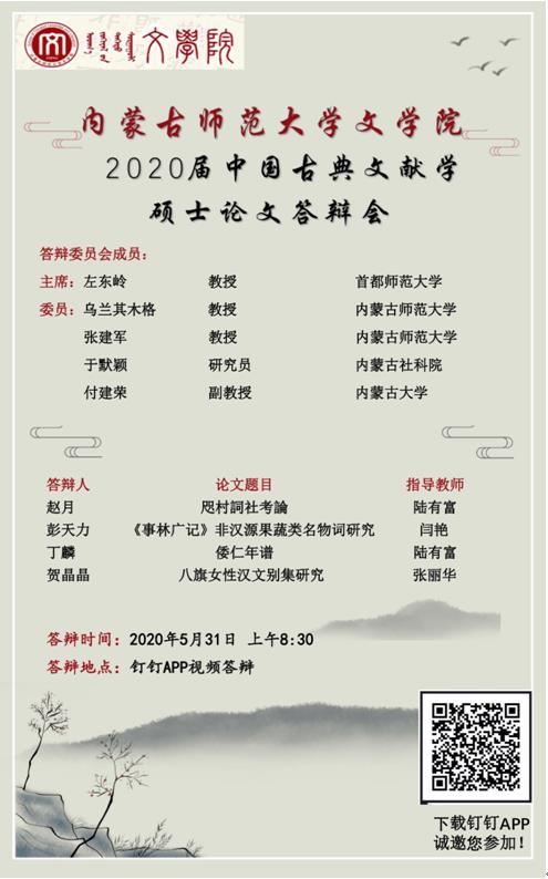 中国古典文献学专业定于2020年5月31日上午8:30召开硕士毕业生论文答辩会。受新冠疫情的影响,本次答辩采用网络答辩方式。首都师范大学pg娱乐电子游戏官网入口博士生导师左东岭教授应邀担任本次答辩主席。欢迎广大师生参加交流。