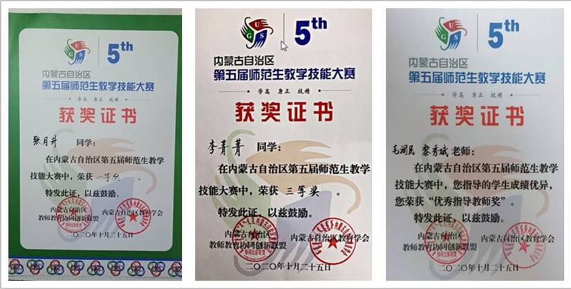 10月23—26日,内蒙古自治区高校师范生教学技能比赛在包头师范学院举行,pg娱乐官网级汉语言文学专业2018级公费师范班张月升同学获得文科组第一名,2018级普师班李菁菁同学获得第三名。黎秀娥博士、毛润民老师获“优秀指导教师”称号。