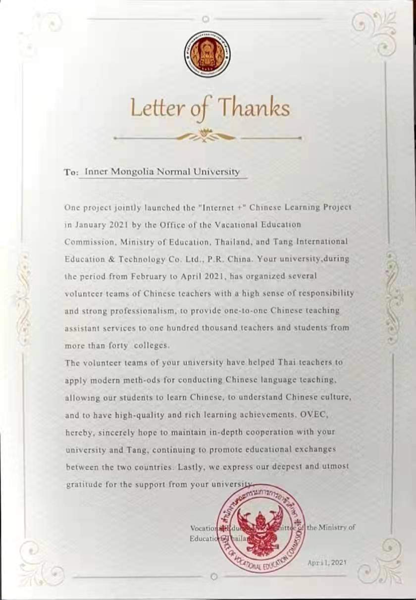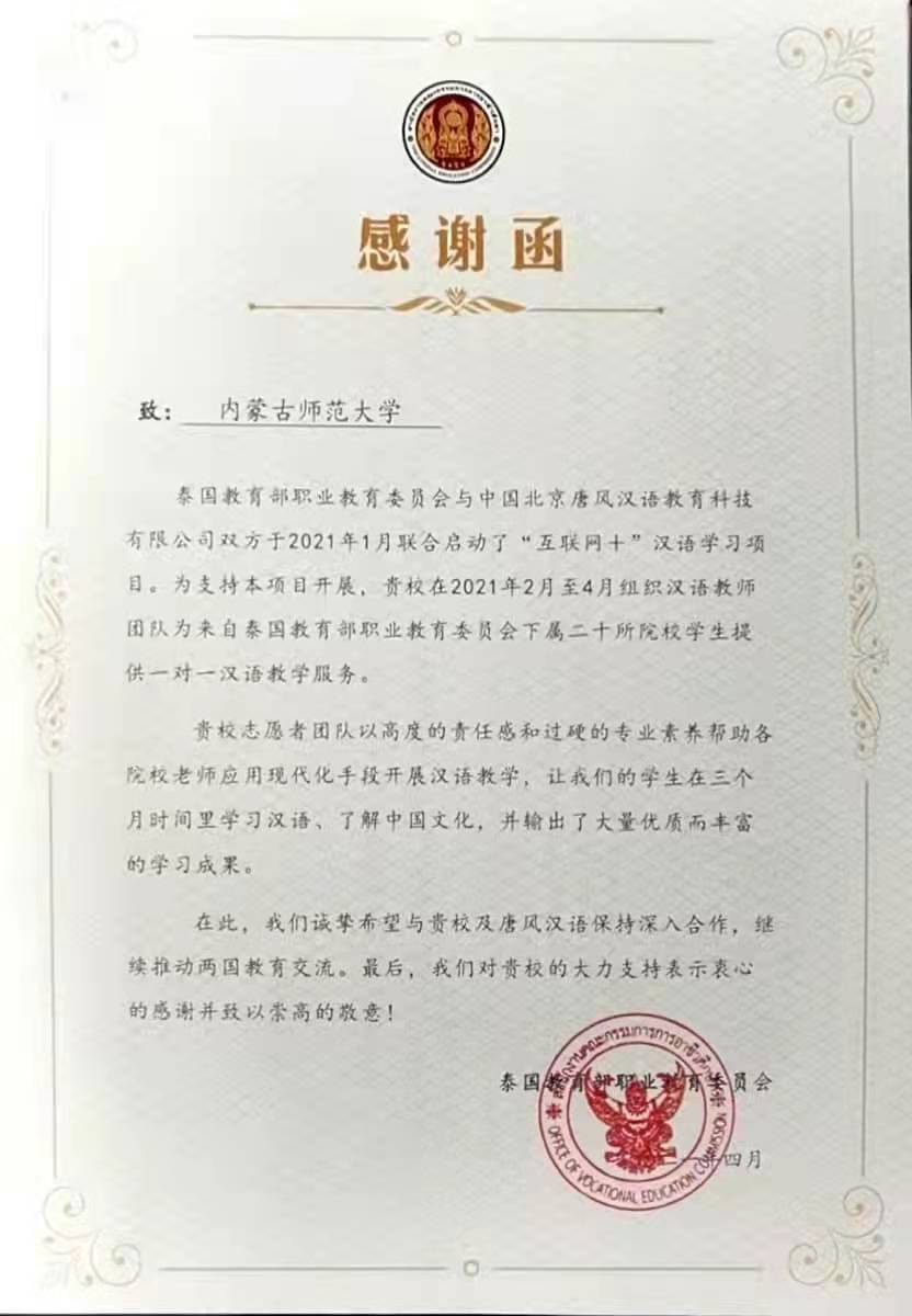 泰国教育部职业教育委员会与中国唐风汉语教育科技有限公司双方于2021年1月联合启动了“互联网+”汉语学习项目,pg娱乐电子游戏官网入口20级汉语国际教育硕士生24人及其余八所高校硕士生参与此次线上教学活动,活动于2021年4月圆满结束。泰国教育部职业教育委员会就此次汉语学习项目发来感谢信。感谢信全文如下: