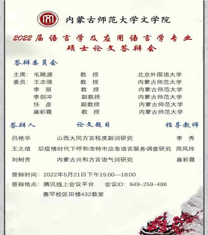 语言学与应用语言学专业定于2022年5月21日下午(15:00—18:00)召开2022届硕士学位论文答辩会。根据《关于做好2022年上半年博士、硕士研究生学位授予工作的通知》《关于做好疫情防控期间2022届研究生毕业答辩工作的通知》的要求,本次答辩采用的是线上和线下相结合的方式。网络视频答辩使用的远程会议软件为腾讯会议,会议号为949259486,线下会场为赛罕校区田楼432。本次答辩会特别邀请了北京外国语大学教授、博士生导师毛眺源担任答辩主席。欢迎广大师生参加交流。