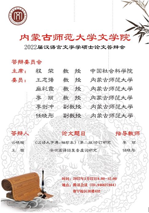 汉语言文字学专业定于2022年5月22日上午(9:00-12:00)召开2022届硕士学位论文答辩会。根据学校《关于做好2022年上半年博士、硕士研究生学位授予工作的通知》《关于做好疫情防控期间2022届研究生毕业答辩工作的通知》的要求,本次答辩采取线上与线下相结合的方式进行,线上使用远程会议软件为腾讯会议(会议号:946627864),线下地点为赛罕校区田楼432教室。本次答辩会特别邀请中国社会科学院教授、博士生导师程荣担任答辩主席。欢迎广大师生参加交流!