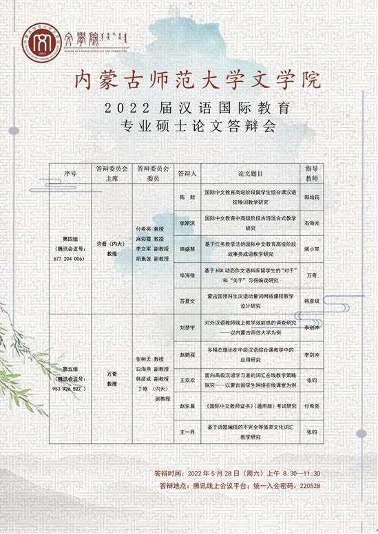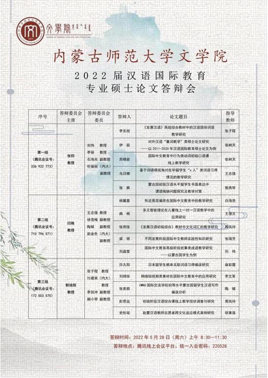 汉语国际教育专业定于2022年5月28日上午(8:30—11:30)召开2022届硕士学位论文答辩会。根据《关于做好2022年上半年博士、硕士研究生学位授予工作的通知》《关于做好疫情防控期间2022届研究生毕业答辩工作的通知》的要求,本次答辩采用的方式为网络视频答辩,使用的远程会议软件为腾讯会议。本次答辩由25位专家组成5个答辩委员会,由闫艳、许晋、郭培筠、万奇、张钧五位教授分别担任答辩委员会主席。本次答辩特别邀请了内蒙古大学的许晋、付建荣、赵金色、丁艳、忻丽丽五位校外专家。欢迎广大师生参加交流!