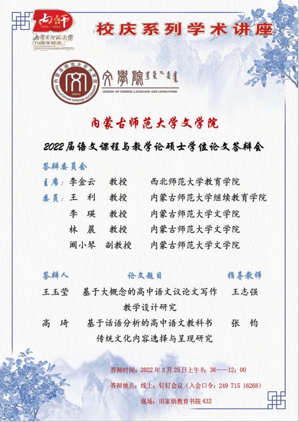 语文课程与教学论专业定于2022年5月25日上午(8:30—12:00)召开2022届硕士学位论文答辩会。根据《关于做好2022年上半年博士、硕士研究生学位授予工作的通知》《关于做好疫情防控期间2022届研究生毕业答辩工作的通知》的要求,本次答辩采用的方式为“现场+线上”的答辩形式,现场答辩会设在田家炳教育书院432,使用的线上会议软件为钉钉会议,入会口令:24971516268。本次答辩会特别邀请了西北师范大学教育学院李金云教授担任答辩主席。欢迎广大师生参加交流。