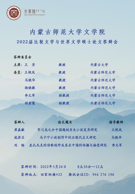 比较文学与世界文学专业定于2022年5月26日上午(8:30—12:00)召开2022届硕士学位论文答辩会。根据《关于做好2022年上半年博士、硕士研究生学位授予工作的通知》《关于做好疫情防控期间2022届研究生毕业答辩工作的通知》的要求,本次答辩为网络视频答辩,使用的远程会议软件为腾讯会议,会议号为946 376 196。本次答辩会特别邀请了内蒙古大学文学与新闻传播学院教授王芳担任答辩主席。欢迎广大师生参加交流。