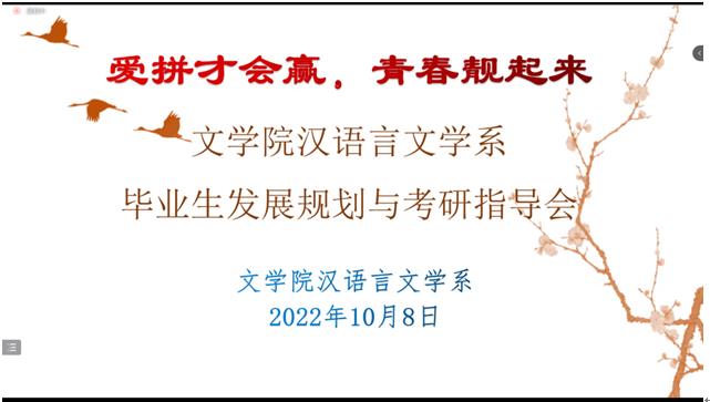 10月8日下午,pg娱乐官网汉语言文学系召开毕业生发展规划与考研指导会。受新冠疫情影响,本次会议以云端线上方式进行。汉语言文学系主任、教工第一支部书记刘伟教授,汉语言文学系副主任胡素莲博士,2022级新生班主任张丽娟博士、孙亚楠博士、王雪博士,以及汉语言文学专业2019级本科生、2021级和2022级部分本科生共120余人参加了会议。
