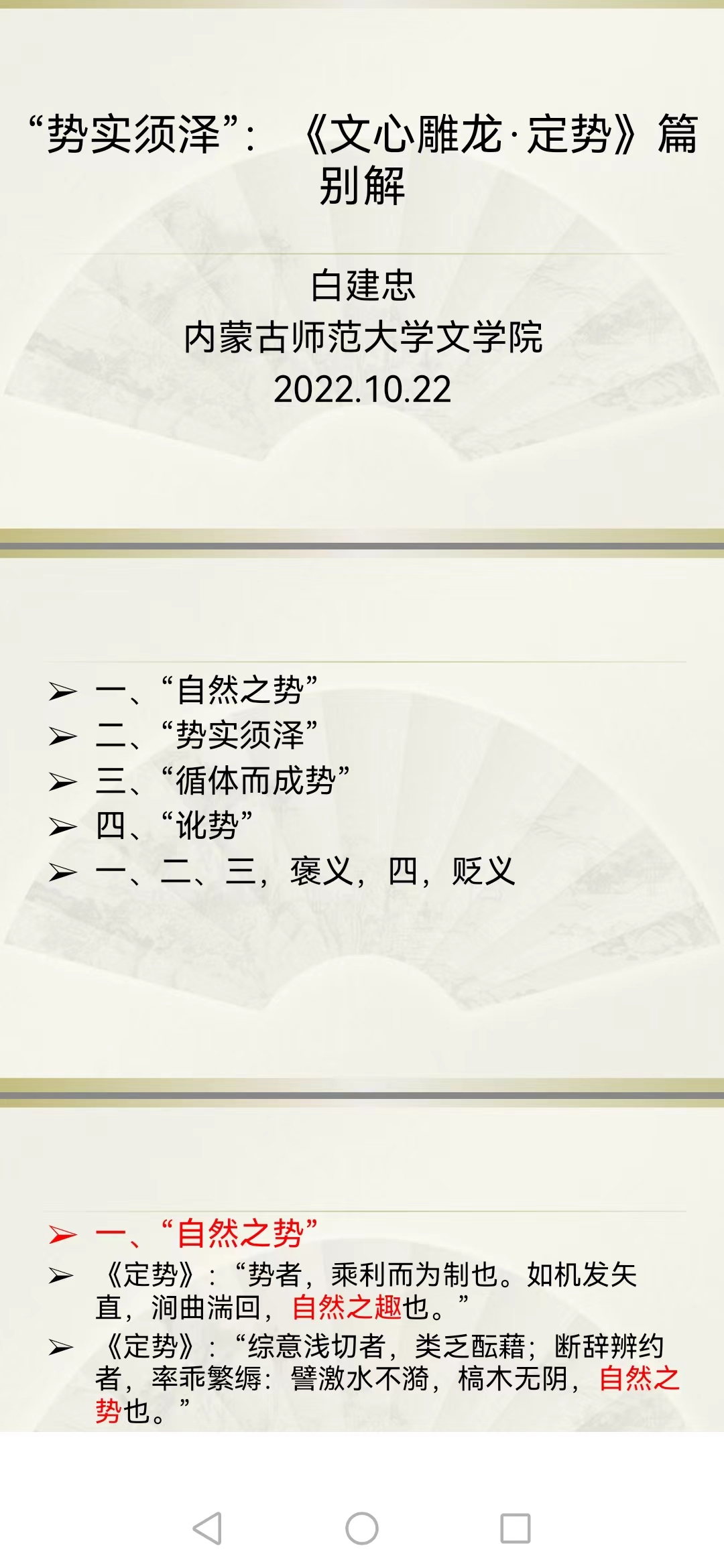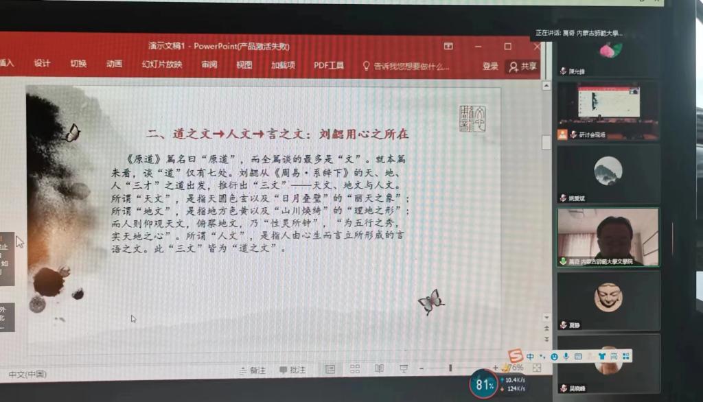 10月21日至23日,由中国《文心雕龙》学会、安徽师范大学pg娱乐电子游戏官网入口、中国诗学研究中心共同主办的“中国《文心雕龙》学会第十六届年会暨国际学术研讨会”在芜湖召开。由于疫情原因,会议以线上和线下结合的方式举行,来自海内外的百余名学者参加了本次会议,pg娱乐官网教师万奇教授、高林广教授、白建忠教授应邀以线上的方式参会。万奇教授在大会闭幕式上,做了题为《以“文”为本:〈文心雕龙·原道〉篇新解》的学术报告,白建忠教授在小组会议上做了题为《“势实须泽”:<文心雕龙·定势>别解》的学术报告,并担任线上第一组学术研讨评议人。高林广教授出席了理事会议,并参加了有关学术活动。