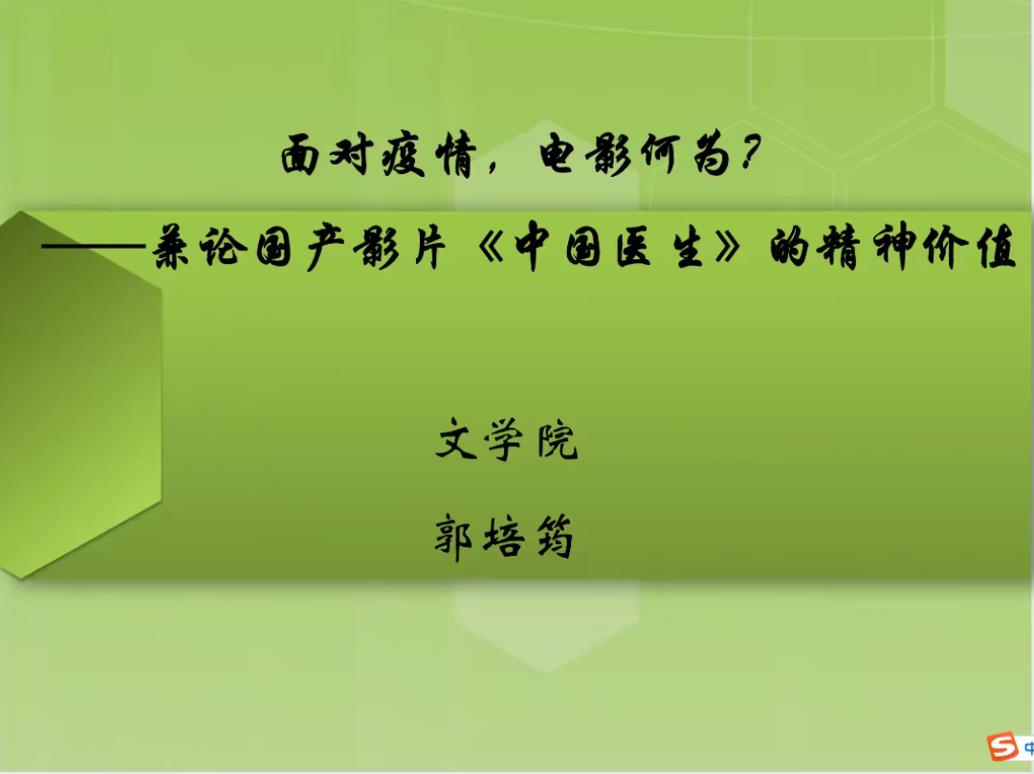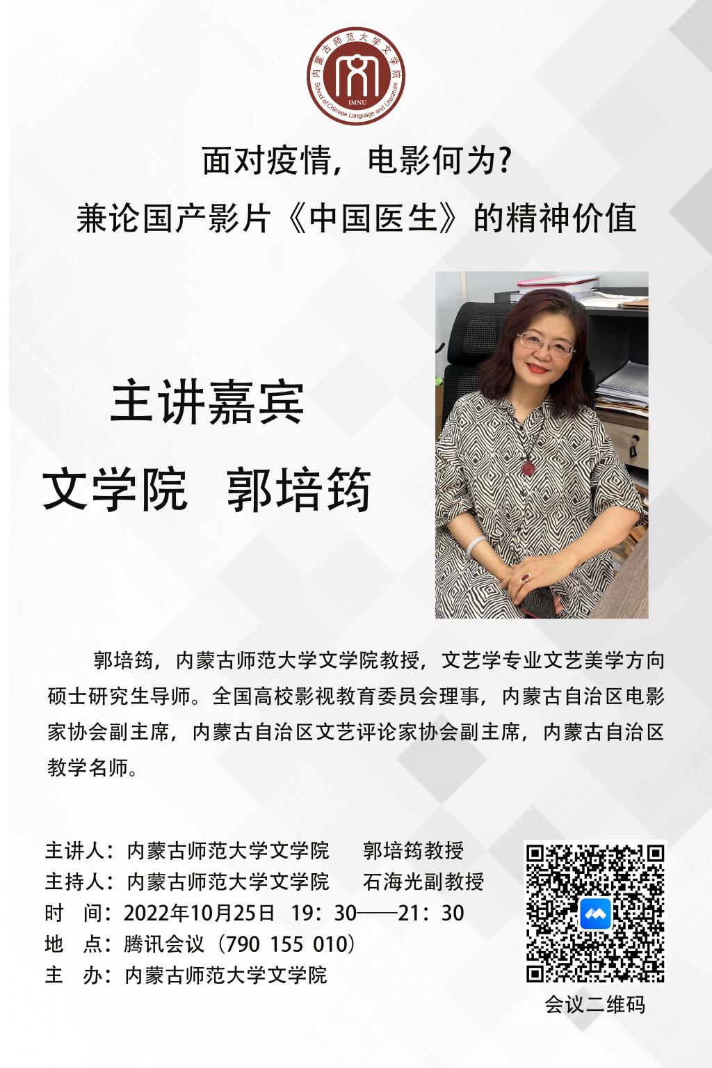 2022年10月25日,pg娱乐电子游戏官网入口结合当前抗疫形势,组织了抗疫专题特别教研活动,由郭培筠教授做了题为《面对疫情,电影何为?——兼论国产影片<中国医生>的精神价值》的专场讲座。
