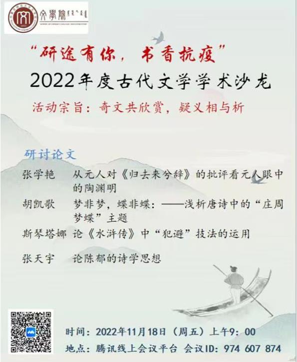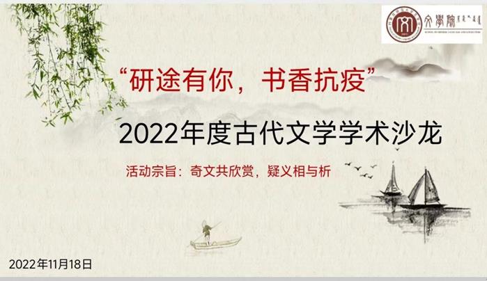 独学而无友,则孤陋而寡闻。勤学而交流,则博学而睿智。2022年11月18日上午,pg娱乐官网中国古代文学学位点成功举办了主题为“研途有你,书香抗疫”的2022年度古代文学学术沙龙。古代文学硕士点的高林广、陆有富、石海光、付希亮、刘伟、张丽杰6位导师和高国庆、赵玉龙、马奥远等古代文学课教师以及学位点的全体研究生共40余名师生参加了本次学术沙龙活动。受新冠疫情影响,本次学术沙龙采取线上方式进行。