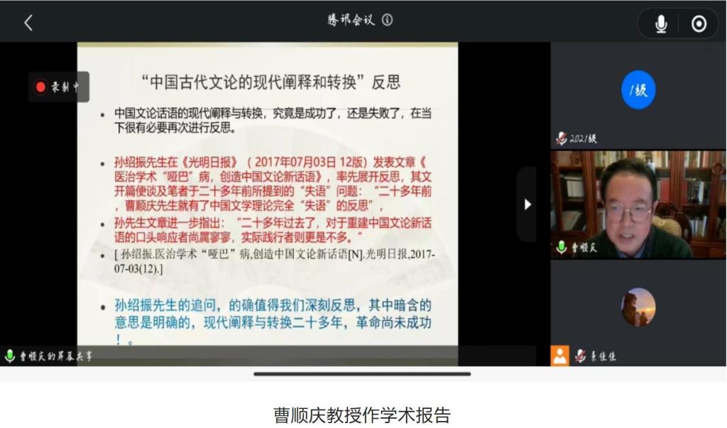 2月12日的活动主要为学术论文(读书报告)的汇报与点评及营员研讨。活动按学科分为四组,分别是中国古代文学组、中国现当代文学组、外国文学组和语言学、文字学组,共50名学生做了线上汇报。pg娱乐官网教师刘伟教授、李丽教授、李杉婵副教授和孙静副教授担任各学科组长,组织了各组的论文(读书报告)汇报评议与营员研讨活动。
