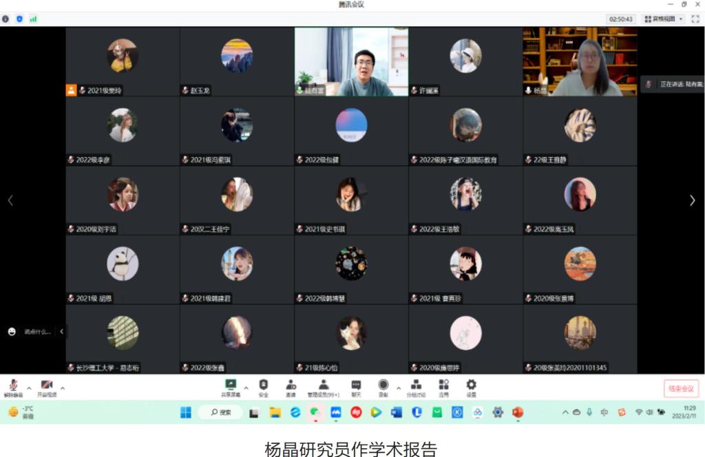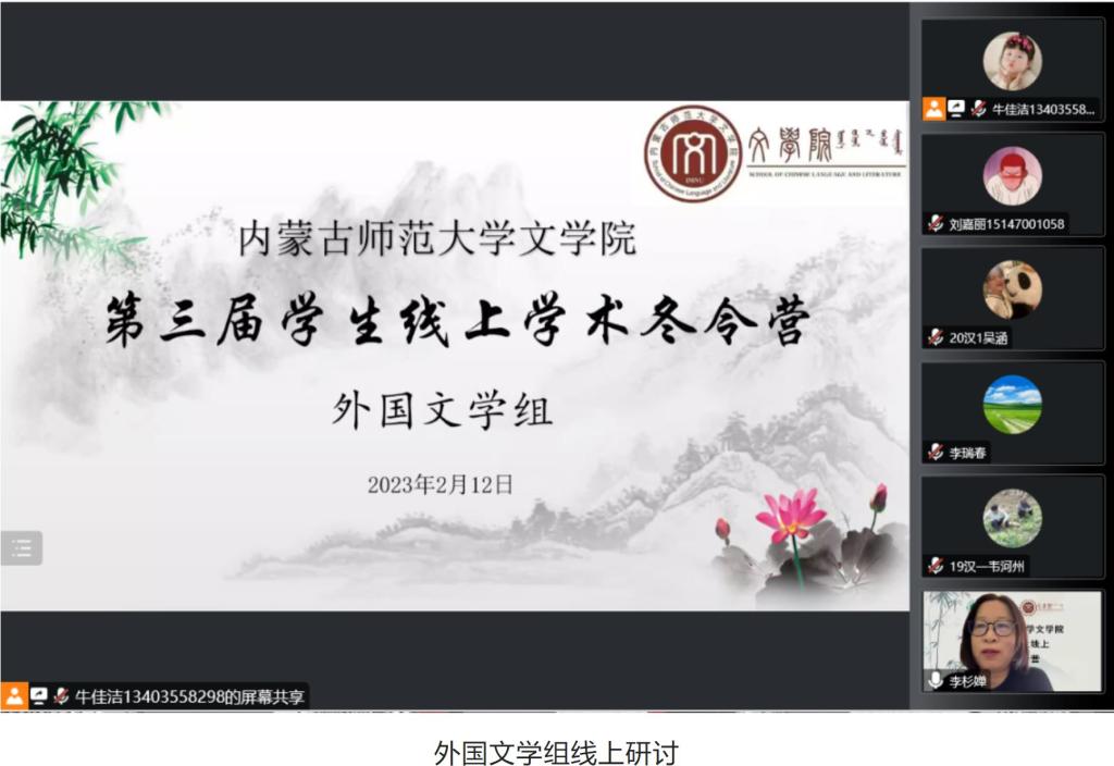 2023年2月12日,为期两天的pg娱乐电子游戏官网入口学生线上学术冬令营活动圆满落下帷幕。本次冬令营面向全国高校在读中文专业学生招生,经过严格选拔,共招收学员130人,其中,除本院各年级各专业学生之外,还有来自西安外国语大学、中央民族大学、曲阜师范大学、陕西理工大学、安徽大学、长沙理工大学、呼伦贝尔学院、赤峰学院等高校的学生参加。活动形式主要包括知名专家学术讲座、校友报告、学术论文(读书报告)汇报与点评、营员研讨等内容。