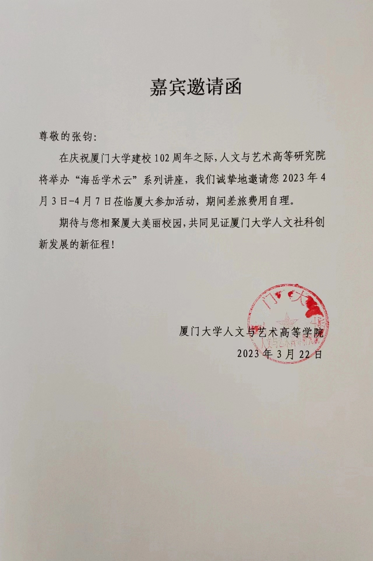 4月3日至4月6日,pg娱乐官网张钧副院长受邀参加了厦门大学人文与艺术高等研究院主办的“海岳学术云”系列讲座。讲座主讲嘉宾有童世骏、葛兆光、连辑、李东珅、俞敏洪等诸位先生。系列讲座由厦门大学人文与艺术高等研究院院长易中天主持并对话。