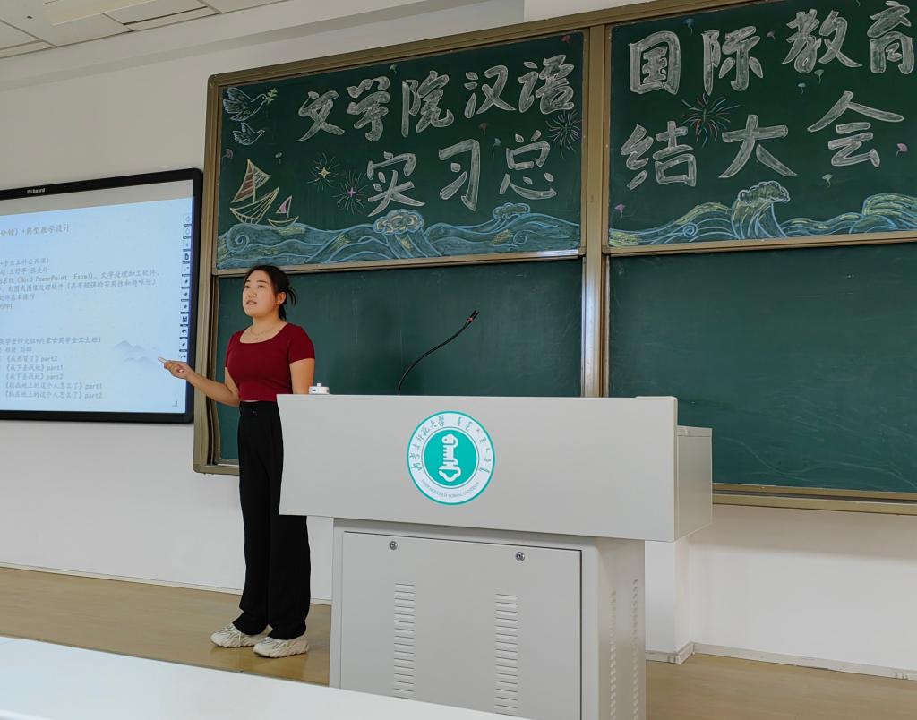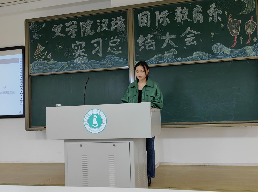 李胜南同学从教育实习、教育研习、课外实践活动等方面分享了实习成果,并向学弟学妹们介绍了汉语国际教育专业的职业生涯规划。