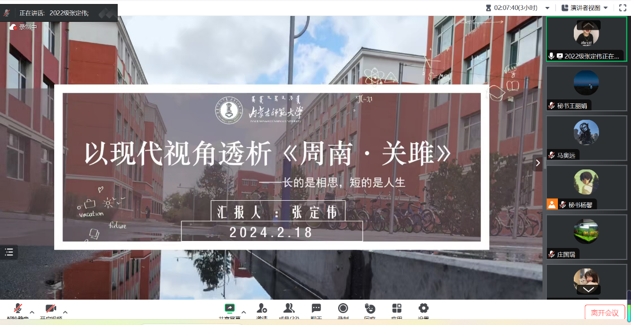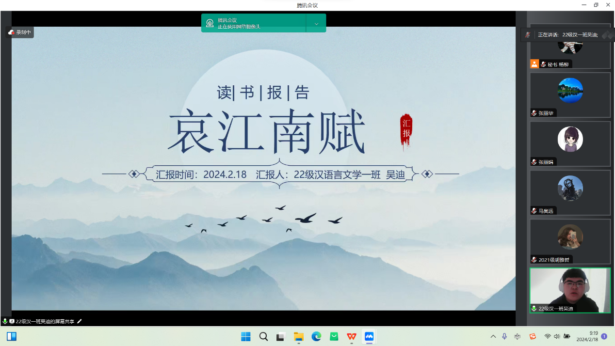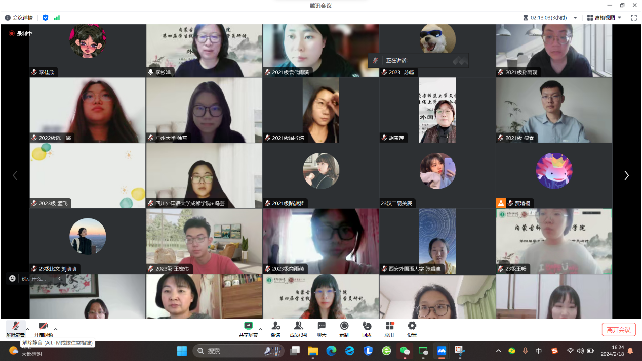 2月18日的活动主要为学术论文(读书报告)的汇报与点评及营员研讨。活动按学科分为四组,分别是中国古代文学组、中国现当代文学组、外国文学组和语言学、文字学组,共57名学生做了线上汇报。pg娱乐官网教师李杉婵、孙静、马奥远、刘婕分别担任各学科组长,组织了各组的论文(读书报告)汇报评议与营员研讨活动。
