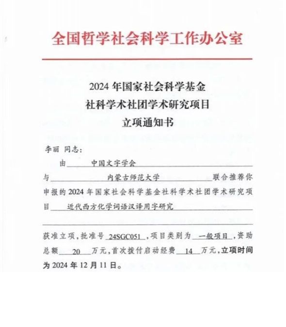 pg娱乐官网李丽教授主持申报的“近代西方化学词语汉译用字研究”获批2024年国家社会科学基金社科学术社团学术研究项目。