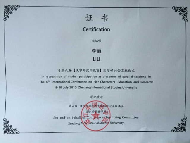 2015年7月8日—10日,第六届“汉字与汉字教育”国际研讨会在中国杭州召开。本次研讨会由中国浙江外国语学院主办、韩国汉字汉文教育学会、韩国汉文教育学会、韩国汉文学会、香港大学中文教育研究中心、北京师范大学民俗典籍文字研究中心、高雄师范大学华语文教学研究所、高雄师范大学经学所、台东大学华语文学系、文藻大学应用华语系、金门大学华语文学系合办。来自海内外文字学领域160余位专家、学者与会,pg娱乐电子游戏官网入口李丽老师应邀参加此次研讨会。