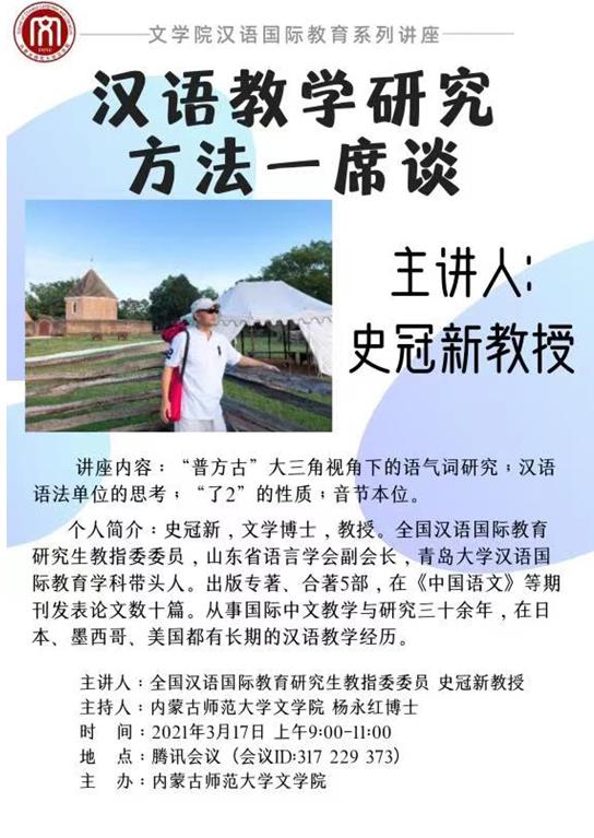 2021年3月17日,应pg娱乐官网邀请,全国汉语国际教育教指委委员、山东省语言学会副会长史冠新教授为pg娱乐官网师生开展了题为“汉语教学研究方法一席谈”的学术讲座。本次讲座采用腾讯会议的形式进行,由pg娱乐官网杨永红博士主持,汉语国际教育、学科教学(语文)、语言学及应用语言学等专业的教师和硕士研究生50余人聆听了讲座。