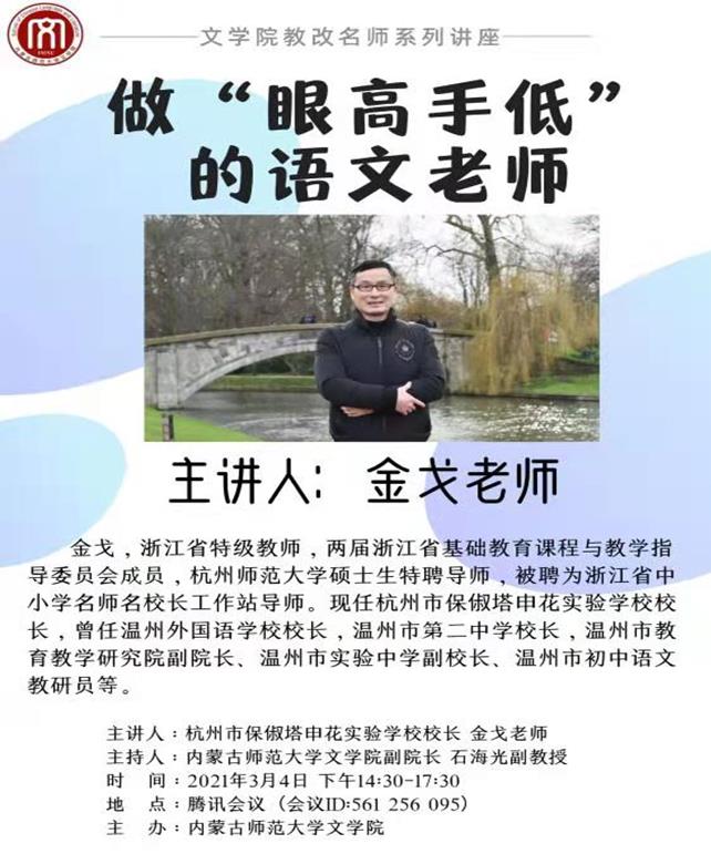 3月4日下午,杭州保俶塔申花实验学校校长金戈为pg娱乐官网特岗学员与语文教育硕士做题为《做“眼高手低”的语文老师》的学术讲座。石海光副院长主持了会议。