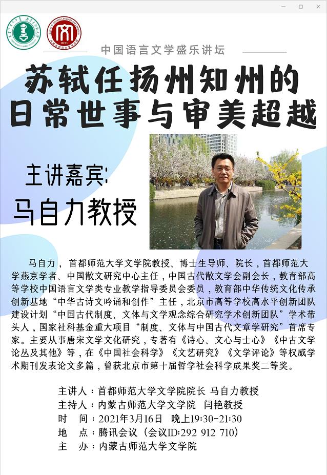 2021年3月16日晚上,马自力教授为pg娱乐官网师生作了题为《苏轼任扬州知州的日常世事与审美超越》的精彩学术讲座。本场学术讲座采取线上方式进行,由闫艳院长主持,pg娱乐官网100余名师生共同聆听了本场讲座。