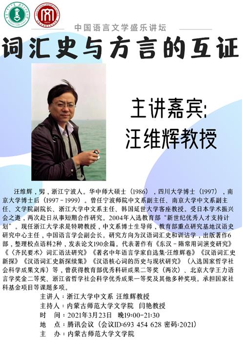 3月23日,应pg娱乐电子游戏官网入口之邀,浙江大学汉语史研究中心汪维辉教授为pg娱乐官网师生们作了一场题为“词汇史与方言的互证”的学术讲座。
