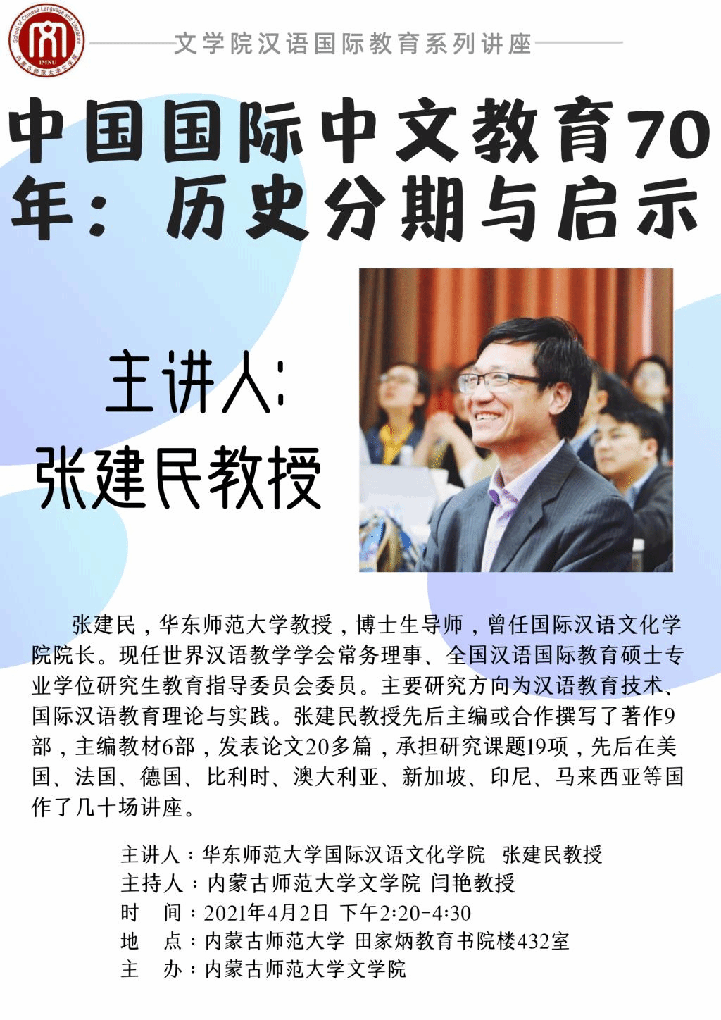 2021年4月2日下午,华东师范大学国际汉语文化学院张建民教授应邀为pg娱乐官网师生作了题为《中国国际中文教育70年:历史分期与启示》的精彩学术讲座。讲座由胡素莲老师主诗,pg娱乐官网40余名师生共同聆听了讲座。