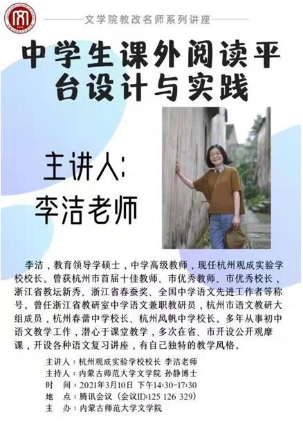 2021年3月10日下午,杭州市观成实验学校校长李洁为pg娱乐官网师生做了一场题为“中学生课外阅读平台设计与实践”的精彩学术讲座。语文学科特岗培训教师,以及pg娱乐官网学科教学语文、汉语国际教育专业的研究生聆听了讲座。