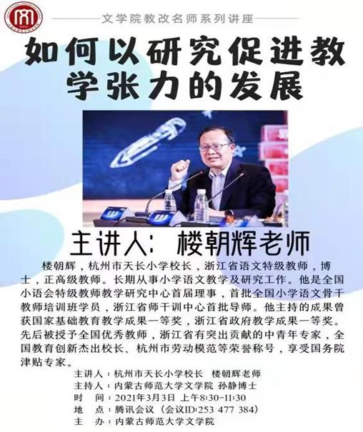 2021年3月3日上午,杭州市天长小学校长楼朝辉为特岗培训教师和pg娱乐电子游戏官网入口学科语文、汉语国际教育硕士专业研究生作了精彩学术讲座,讲座的主题是:以研促教;基础教育青年教师发展的有效路径。pg娱乐官网学科教学(语文)硕士点点长孙静博士主持了会议。