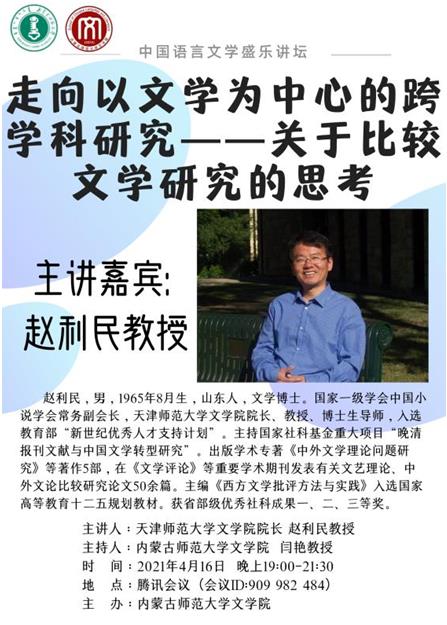2021年4月16日晚,pg娱乐官网第41期“中国语言文学讲坛”开讲。天津师范大学赵利民教授为pg娱乐官网师生做了题为《走向以文学为中心的跨学科研究——关于比较文学研究的思考》的精彩学术讲座,讲座采用线上形式进行。本场讲座由闫艳院长主持,校内外共130余名师生聆听了讲座。