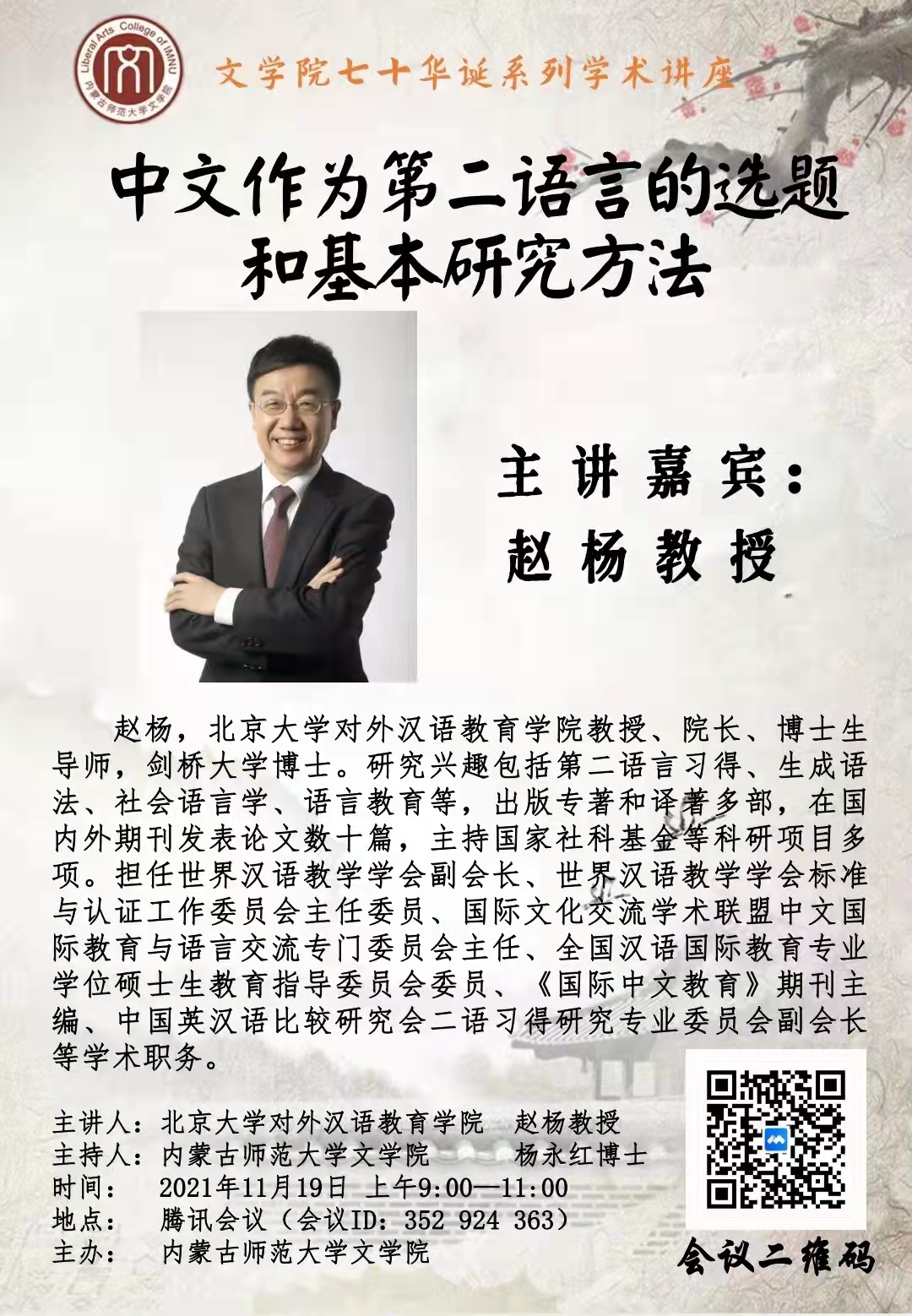 2021年11月19日上午,应pg娱乐官网邀请,世界汉语教学学会副会长、世界汉语教学学会标准与认证工作委员会主任委员、国际文化交流学术联盟中文国际教育与语言交流专门委员会主任、全国汉语国际教育专业学位硕士生教育指导委员会委员、《国际中文教育》期刊主编、北京大学对外汉语教育学院院长赵杨教授通过线上会议的方式为pg娱乐官网学生做了题为“中文作为第二语言的选题和基本研究方法”的讲座。pg娱乐官网杨永红博士主持了会议。