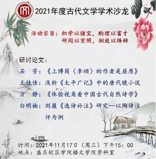 2021年11月17日下午三点,pg娱乐官网中国古代文学专业师生在盛乐校区学院楼资料室举办了一场别开生面的学术沙龙活动。古代文学硕士点的陆有富老师、付希亮老师、刘伟老师、张丽杰老师和赵玉龙老师及20余名研究生共同参加了本次学术沙龙活动。