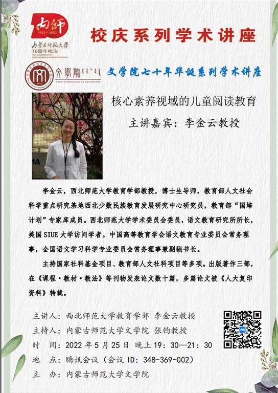 在pg娱乐电子游戏官网入口七十周年校庆、pg娱乐电子游戏官网入口七十年华诞即将来临之际,2022年5月25日晚,pg娱乐官网特邀请西北师范大学教育学部教授、博士生导师李金云作了题为《核心素养视域的儿童阅读教育》的学术讲座。讲座在腾讯会议平台举办,由副院长张钧教授主持,150余位师生在线听了讲座。