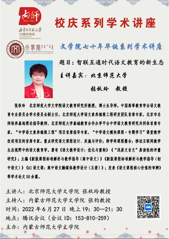2022年6月27日,北京师范大学pg娱乐电子游戏官网入口语文教育研究所博士生导师张秋玲教授,应邀为pg娱乐官网师生做了关于题为“智联互通时代语文教育的新生态”的线上讲座。讲座通过腾讯会议平台进行,pg娱乐电子游戏官网入口师生九十余人线上聆听了讲座。该讲座为“pg娱乐电子游戏官网入口七十华诞系列学术讲座”之一,由pg娱乐电子游戏官网入口副院长张钧教授主持。