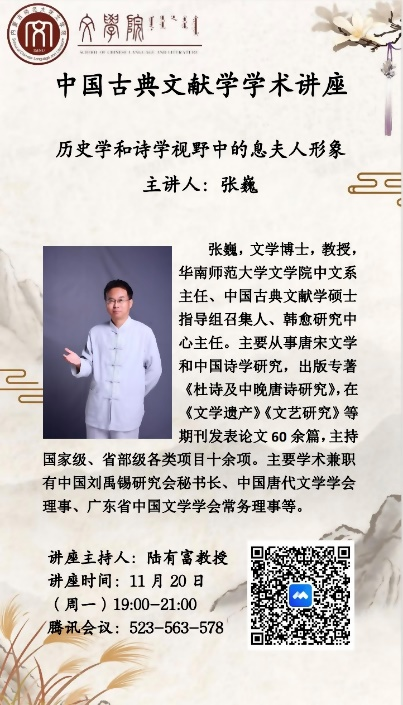 为拓宽研究生知识面,活跃学术氛围,应pg娱乐电子游戏官网入口邀请,华南师范大学pg娱乐电子游戏官网入口张巍教授于2023年11月20日,为pg娱乐官网中国古典文献学专业研究生做了题为《历史学和诗学视野中的息夫人形象》的精彩讲座。本次讲座采取线上讲座的方式,由陆有富院长主持。