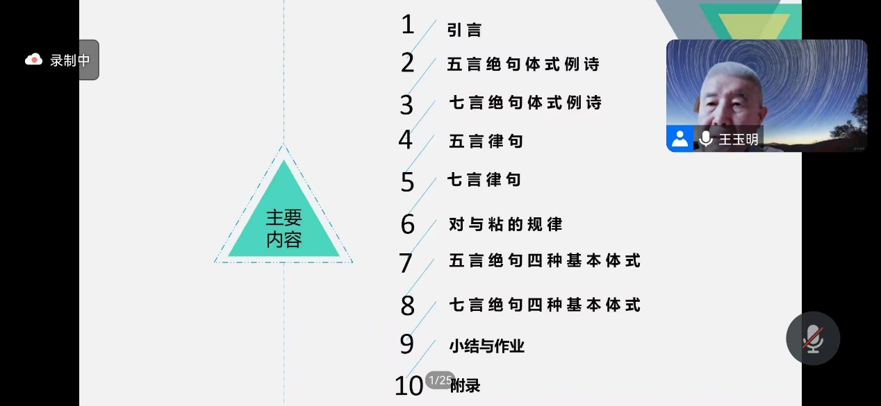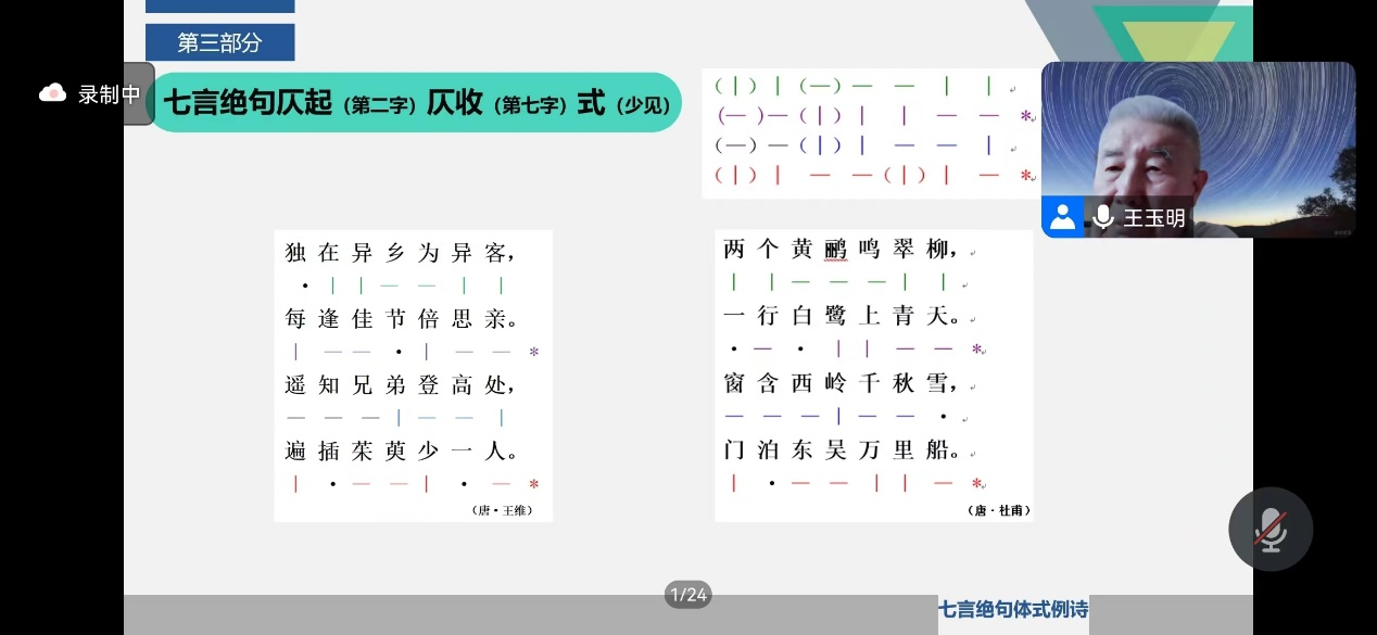 王玉明院士从中国古典诗的分类、五言绝句的体式、七言绝句的体式、五言律句、七言律句、对与粘的规律、五言绝句的四种基本体式、七言绝句的四种基本体式等几个方面,对古典诗词格律作了讲解。