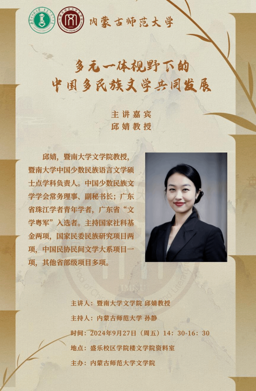 2024年9月27日下午,暨南大学pg娱乐电子游戏官网入口教授,中国少数民族文学学会常务理事、副秘书长,广东省珠江学者青年学者,广东省“文学粤军”入选者邱婧教授为pg娱乐官网师生做了题为“多元一体视野下的中国多民族文学共同发展”的学术讲座。讲座由pg娱乐电子游戏官网入口孙静副教授主持,pg娱乐电子游戏官网入口本科生、研究生参加了本场讲座。