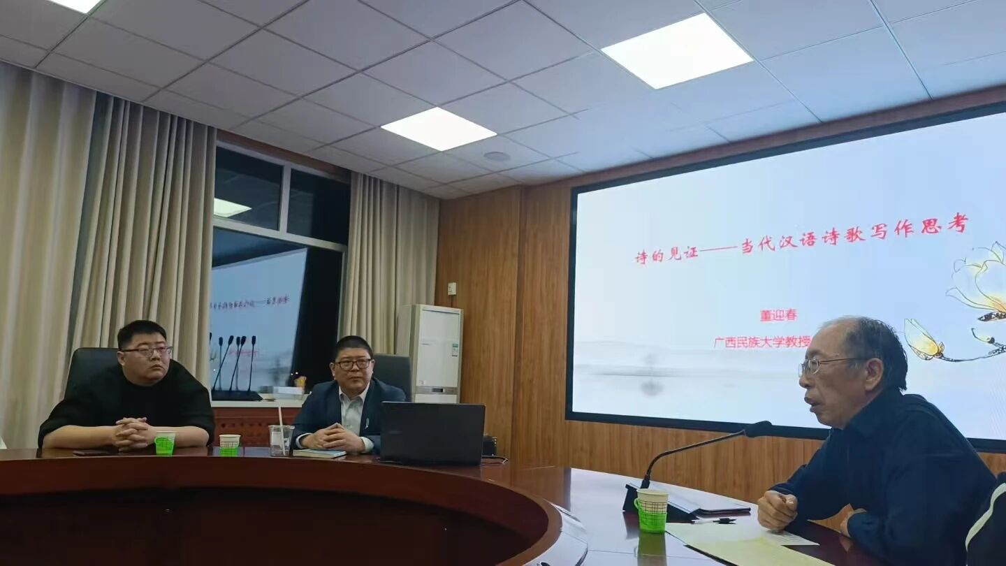 2025年11月16日,pg娱乐官网在盛乐校区院系楼三楼文澜厅举办了一场题为《诗的见证——当代汉语诗歌写作思考》的学术讲座。讲座由广西民族大学pg娱乐电子游戏官网入口教授、博士生导师董迎春主讲,pg娱乐电子游戏官网入口张子程教授主持,70余名硕博士研究生、本科生共同聆听了此次讲座。